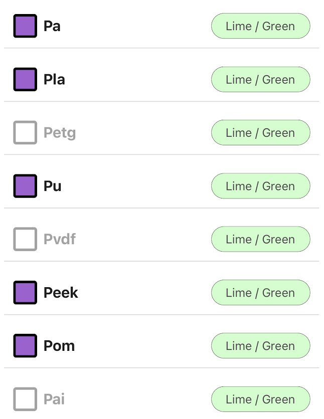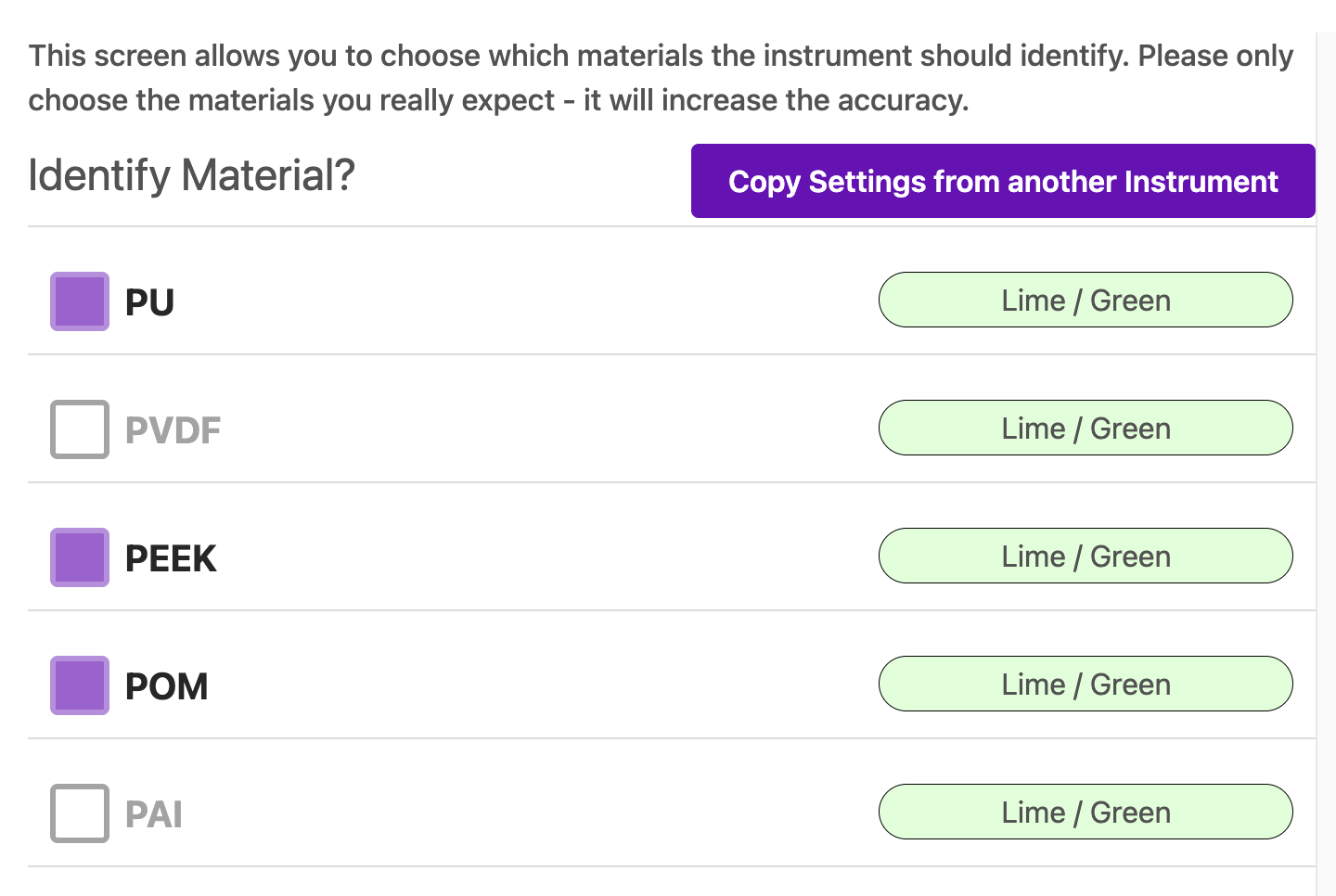 To enable a new material, simply click on the name (or white square) of that material. To disable a material, click on the name (or purple square) of that material. Once you have selected all the materials you want your machine to identify, press "Save materials" and restart your device. | You will now be directed to a new page showing a list of materials that your instrument can identify. The materials enabled on your machine (the materials your instrument can identify) have a purple square on the left, while the materials that are disabled (and therefore, will not be identified) have a white square and are greyed out.