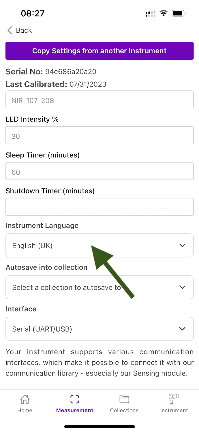 | Once your Matoha device is connected to the Matoha app, select "Instrument Settings".