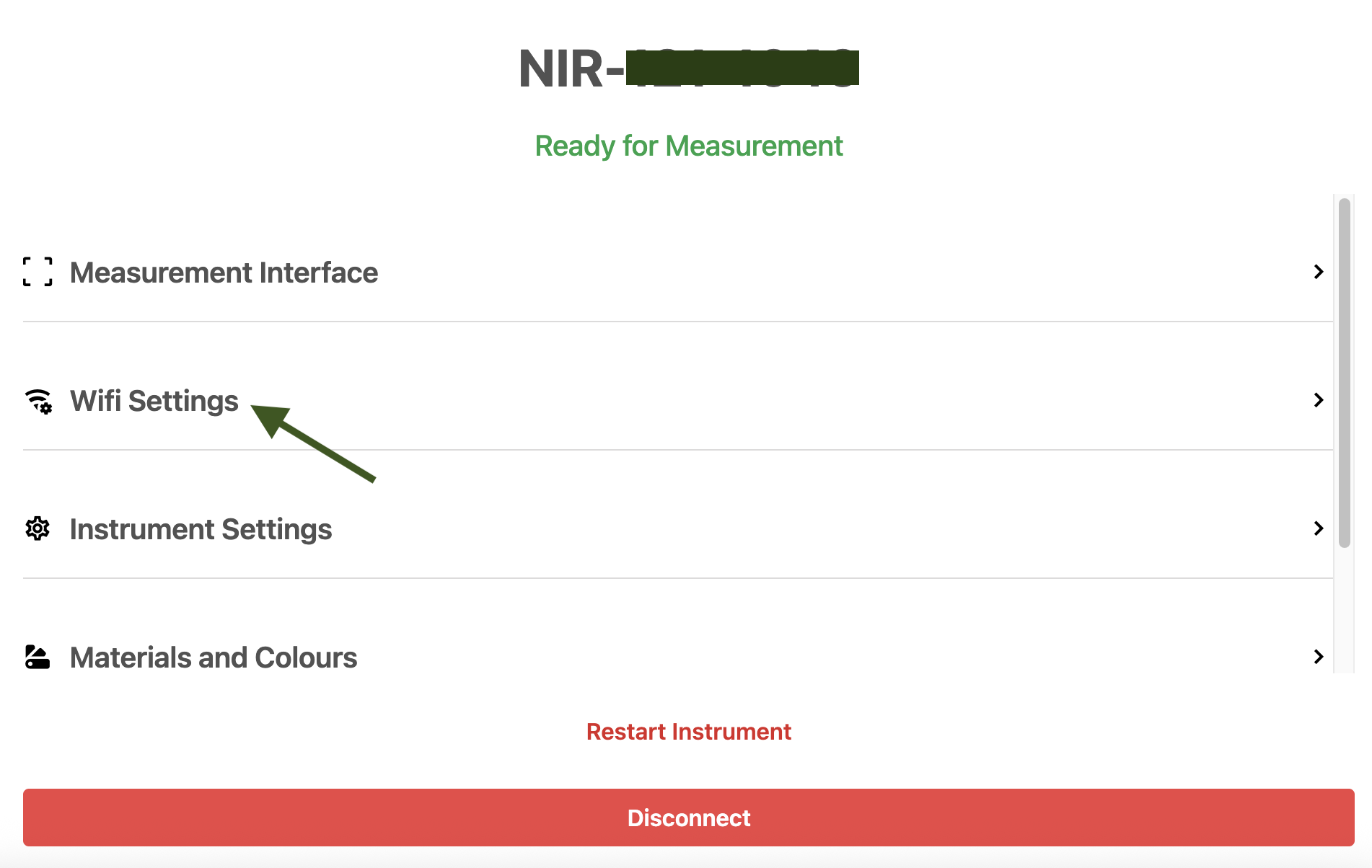 You will then be prompted to restart your device to allow the update to go through. | 1.After connecting to the instrument, you will see the screen below. 2. Press the button "WiFi settings".