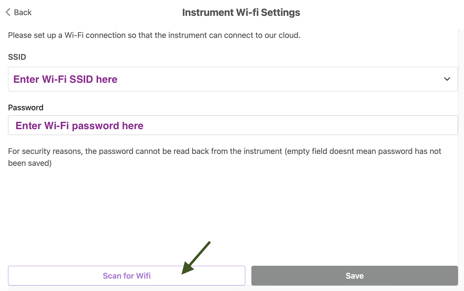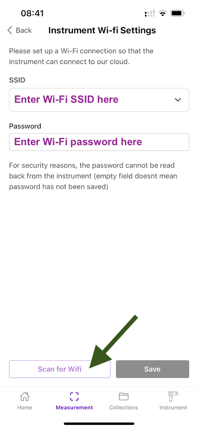 3. Then, select "Scan for WiFi" or enter the Wi-Fi SSID (name of the network) and the password and press Save.