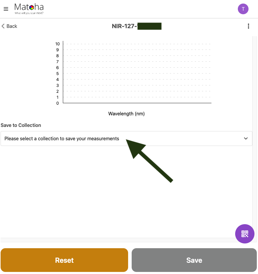 4. Press "Save" - this uploads the measurement into our cloud where it is securely stored. You can now measure further samples. | 1.Select your collection (or create a new collection).