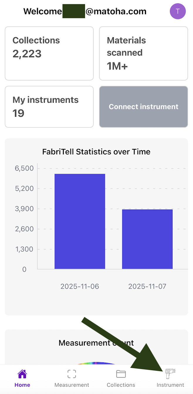 Your screen will then show you all the devices connected to your account. Check which machine you want to configure and press the "Materials" icon. If you can't see your machine here, you need to add it to your account first (➕ Adding an Instrument to your Account).