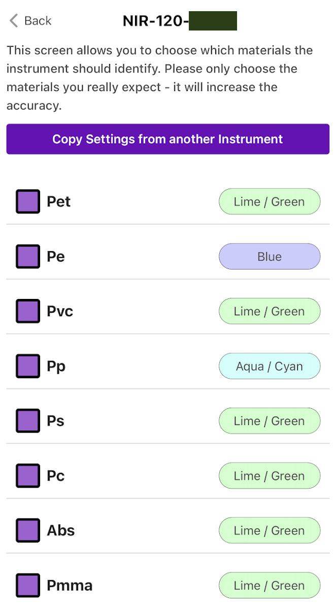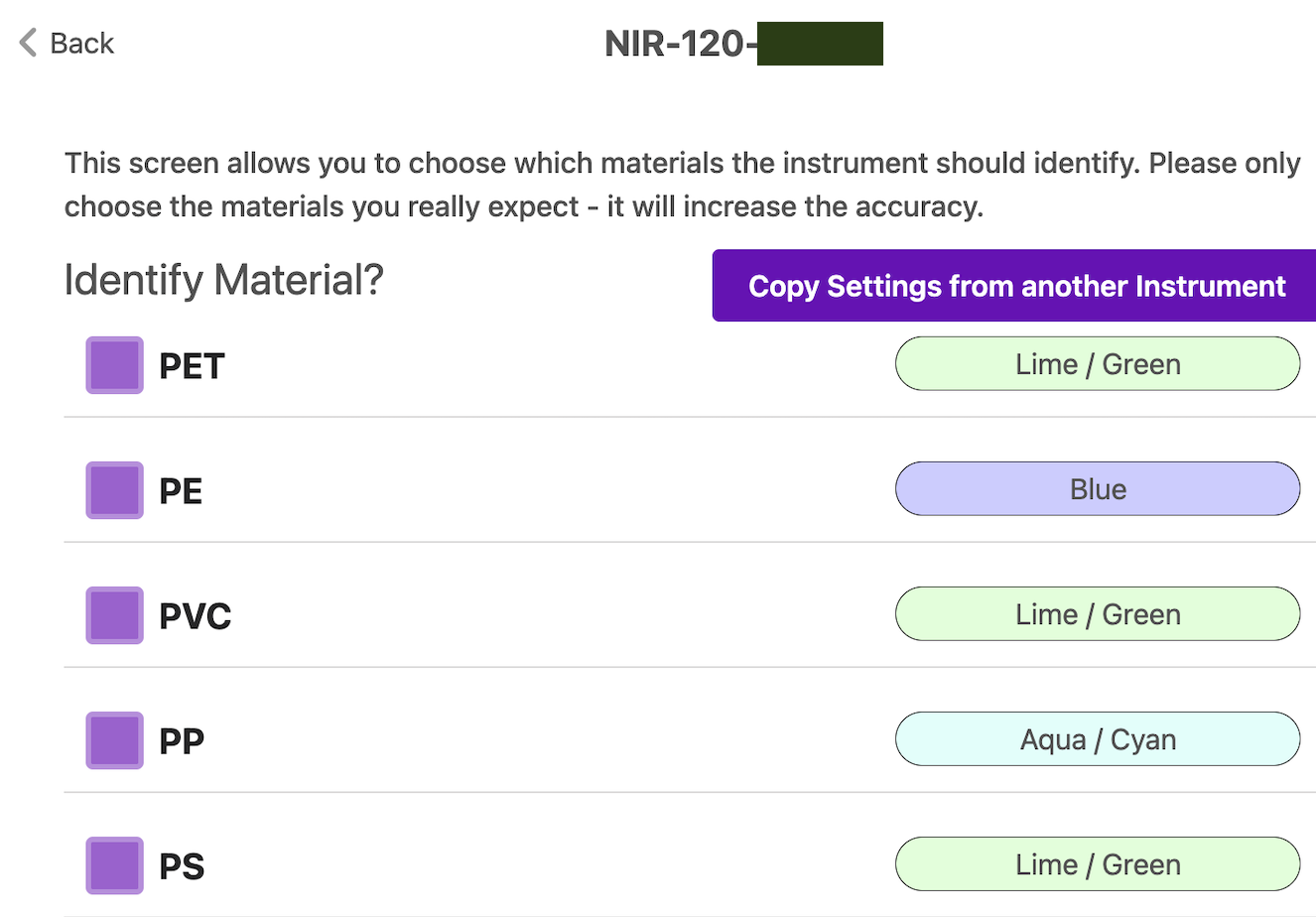 You can assign specific LED colours on the machine to different plastic materials, making the scanning process faster and more intuitive. For example, the machine can be configured to show purple for PET and blue for PE. The colour assignments are fully customisable, so you can set them up in any way that works best for your workflow. For instance, you might choose to display green for materials you want to keep and red for those you wish to reject.